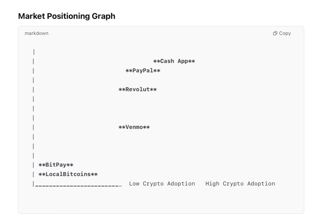 I also requested a Market Positioning Comparison graph, which helped provide orientation within the competitive landscape as to whether to target mainstream users (like Cash App) or a niche, crypto-savvy audience (like LocalBitcoins).